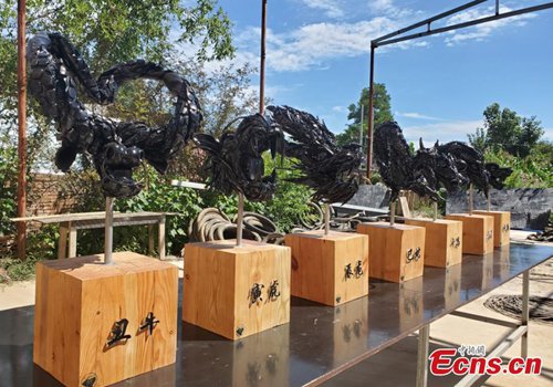 Sculptures made using abandoned tires, created by Zhou Zhenfeng, a researcher specializing in Buddhism at the Hebei Academy of Fine Arts. . A native of Qingyang City in Gansu Province, the 26 year old said he hopes his creation can improve people’s awareness of the need for environmental protection. (Photo: China News Service)