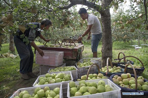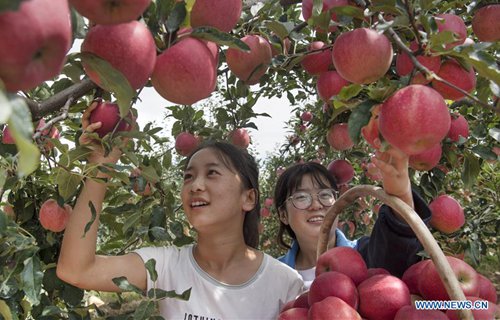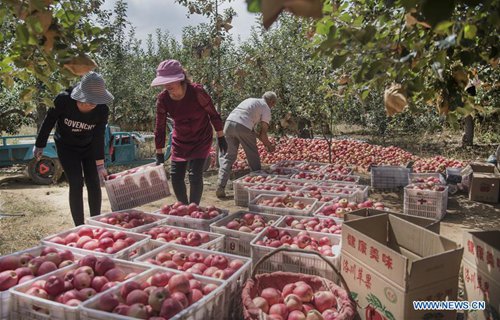 Farmers pick apples in Huaibai Township of Luochuan County, northwest China's Shaanxi Province, Aug. 28, 2019. Home to about 35,000 hectares of apple orchards, Luochuan County is a major apple base in China. It is estimated that more than 900,000 tonnes of apples will be harvested in Luochuan this year. (Photo: Xinhua)