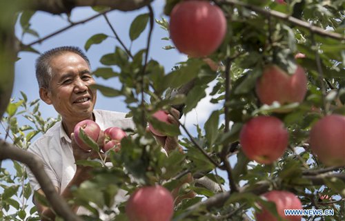 A farmer picks apples in Fangxiang Village of Yongxiang Township, Luochuan County, northwest China's Shaanxi Province, Aug. 28, 2019. Home to about 35,000 hectares of apple orchards, Luochuan County is a major apple base in China. It is estimated that more than 900,000 tonnes of apples will be harvested in Luochuan this year. (Photo: Xinhua)