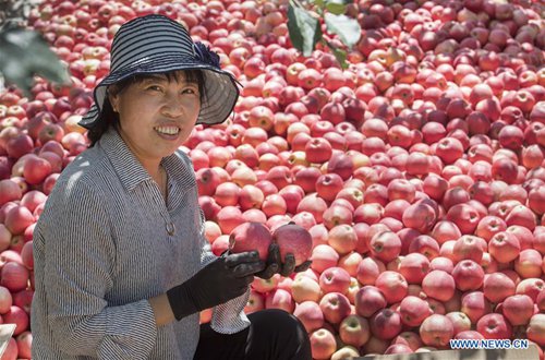 Villager Zhang Yaqin sorts apples to prepare them for market in Fangxiang Village of Yongxiang Township, Luochuan County, northwest China's Shaanxi Province, Aug. 28, 2019. Home to about 35,000 hectares of apple orchards, Luochuan County is a major apple base in China. It is estimated that more than 900,000 tonnes of apples will be harvested in Luochuan this year. (Photo: Xinhua)