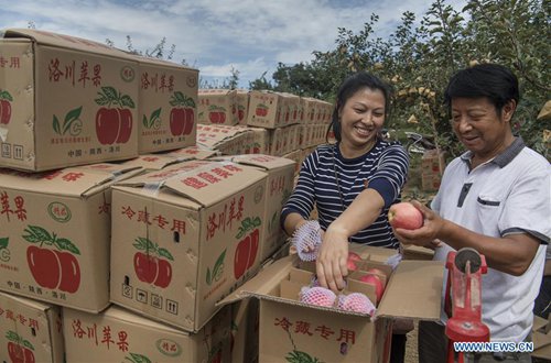 Farmers pack up apples to prepare them for market in Fangxiang Village of Yongxiang Township, Luochuan County, northwest China's Shaanxi Province, Aug. 28, 2019. Home to about 35,000 hectares of apple orchards, Luochuan County is a major apple base in China. It is estimated that more than 900,000 tonnes of apples will be harvested in Luochuan this year. (Photo: Xinhua)