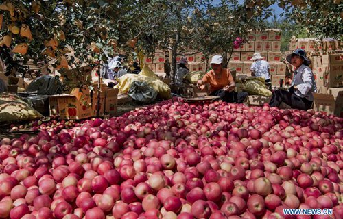 Farmers sort apples to prepare them for market in Fangxiang Village of Yongxiang Township, Luochuan County, northwest China's Shaanxi Province, Aug. 28, 2019. Home to about 35,000 hectares of apple orchards, Luochuan County is a major apple base in China. It is estimated that more than 900,000 tonnes of apples will be harvested in Luochuan this year. (Photo: Xinhua)