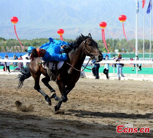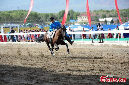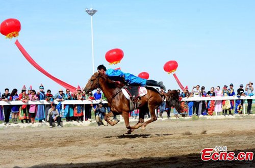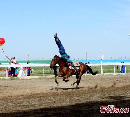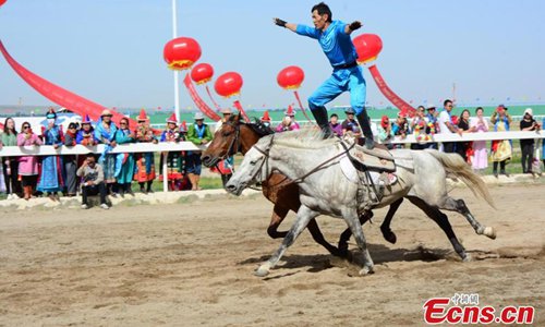 A horse rider shows a stunt during an equestrian performance in Subei Mongol Autonomous County, Northwest China’s Gansu Province. The riders from a local club made all kinds of moves on the running horses, such as standing on two horses in racing ahead. (Photo: China News Service)