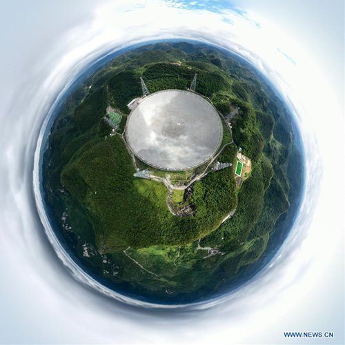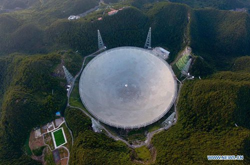 Aerial photo taken on Aug. 27, 2019 shows China's Five-hundred-meter Aperture Spherical radio Telescope (FAST) in southwest China's Guizhou Province. China's FAST, the world's largest single-dish radio telescope, will greet the third anniversary of operation that began in September 2016.(Photo: Xinhua)