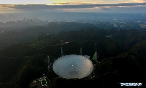 Aerial photo taken on Aug. 27, 2019 shows China's Five-hundred-meter Aperture Spherical radio Telescope (FAST) in southwest China's Guizhou Province. China's FAST, the world's largest single-dish radio telescope, will greet the third anniversary of operation that began in September 2016. (Photo: Xinhua)