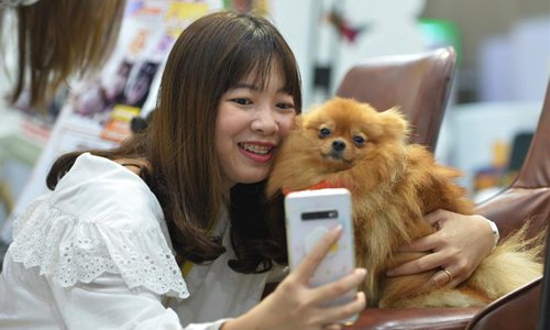 A girl takes selfie with a dog when visiting the Pet Expo Thailand & Pet Expo Championship 2019 in Bangkok, Thailand, Aug. 29, 2019. The Pet Expo Thailand & Pet Expo Championship 2019 would be held at Bangkok International Trade & Exhibition Centre (BITEC) from Aug. 29 to Sept. 1. (Xinhua/Rachen Sageamsak)