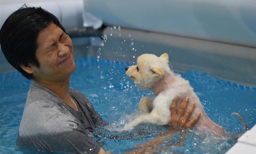 A man trains his dog swimming during the Pet Expo Thailand & Pet Expo Championship 2019 in Bangkok, Thailand, Aug. 29, 2019. The Pet Expo Thailand & Pet Expo Championship 2019 would be held at Bangkok International Trade & Exhibition Centre (BITEC) from Aug. 29 to Sept. 1. (Xinhua/Rachen Sageamsak)