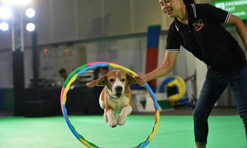 A dog takes part in hoop-jumping during the Pet Expo Thailand & Pet Expo Championship 2019 in Bangkok, Thailand, Aug. 29, 2019. The Pet Expo Thailand & Pet Expo Championship 2019 would be held at Bangkok International Trade & Exhibition Centre (BITEC) from Aug. 29 to Sept. 1. (Xinhua/Rachen Sageamsak)