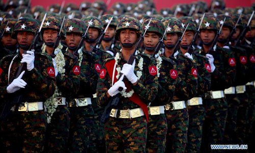 Soldiers march in a formation during a parade to mark the 74th Armed Forces Day in Nay Pyi Taw, Myanmar, March 27, 2019. (File photo: Xinhua)
