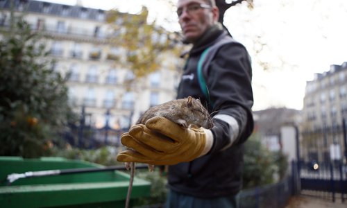 A Paris city employee shows a dead rat in the Saint Jacques Tower park in the center of Paris on Friday. The French capital is on a new rampage against rats, trying to shrink the growing rodent population. Photo: IC