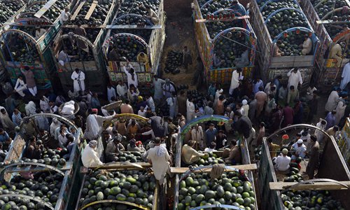 Pakistani farmers gather at a fruit market to sell watermelons in Lahore. File photo: VCG