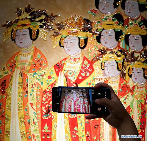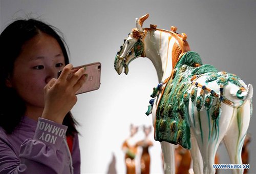 A visitor takes photo of the exhibits during an exhibition on Luoyang tri-colored glazed artworks in Zhengzhou, central China's Henan Province, Sept. 1, 2019. A total of 300 pieces of artworks were displayed on the exhibition. (Photo: Xinhua)