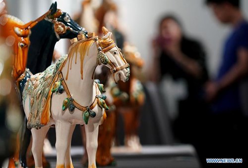 Visitors view an exhibit during an exhibition on Luoyang tri-colored glazed artworks in Zhengzhou, central China's Henan Province, Sept. 1, 2019. A total of 300 artwork were displayed on the exhibition. (Photo: Xinhua)