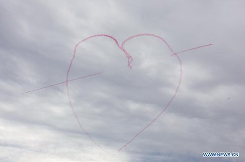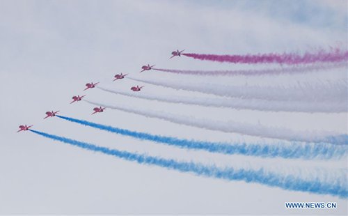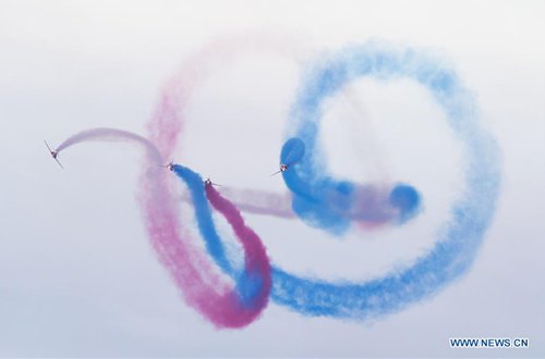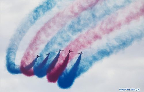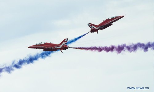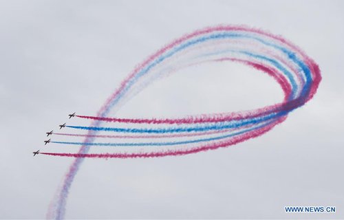 Britain's Royal Air Force Red Arrows perform during the 2019 Canadian International Air Show in Toronto, Canada, Sept. 1, 2019. The annual event is held here from Aug. 31 to Sept. 2. (Photo: Zou Zheng/Xinhua)