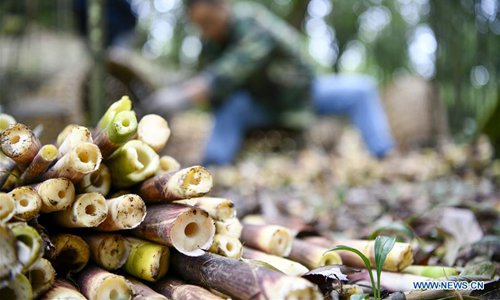 Photo taken on Aug. 30, 2019 shows bamboo shoots on the Jinfo Mountain in Nanchuan District of southwest China's Chongqing. A lucky bamboo shoots collector on the Jinfo Mountain can harvest more than 6,000 bamboo shoots a day, which can increase his income by 7,000 to 10,000 yuan (about 1,398 US dollars) in the harvest season. According to local authorities, Nanchuan District has more than 100,000 mu (about 6,667 hectares) of bamboo shoot forests, which attract more than 10,000 people to collect bamboo shoots every year. (Photo: Xinhua)