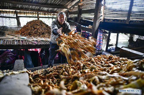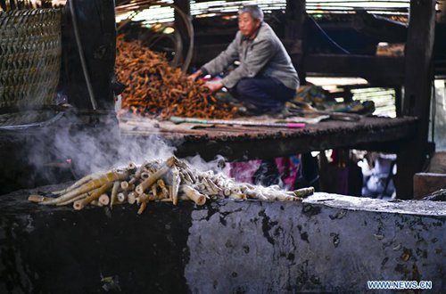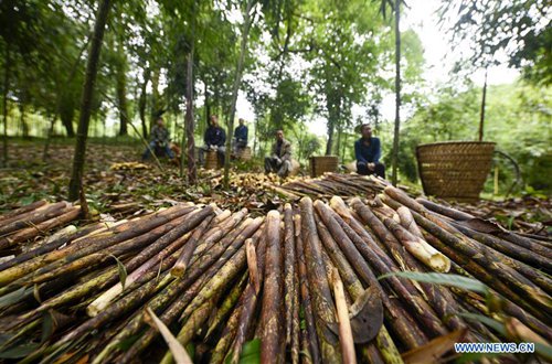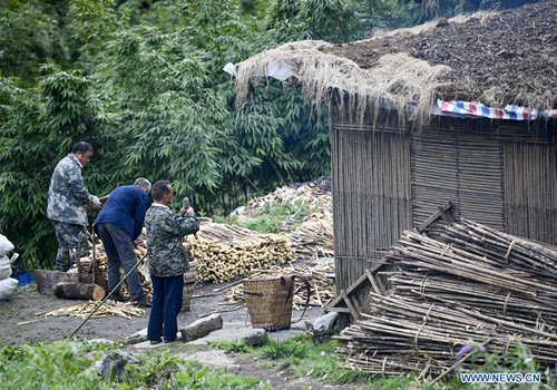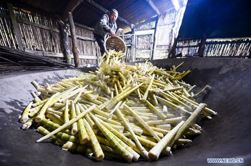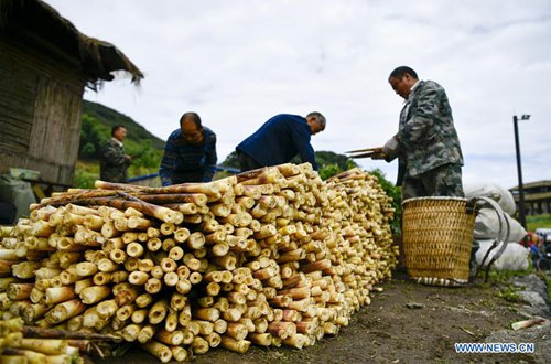 A bamboo shoots collector airs bamboo shoots in a shed on the Jinfo Mountain in Nanchuan District of southwest China's Chongqing, Aug. 30, 2019. A lucky bamboo shoots collector on the Jinfo Mountain can harvest more than 6,000 bamboo shoots a day, which can increase his income by 7,000 to 10,000 yuan (about 1,398 U.S. dollars) in the harvest season. According to local authorities, Nanchuan District has more than 100,000 mu (about 6,667 hectares) of bamboo shoot forests, which attract more than 10,000 people to collect bamboo shoots every year. (Photo: Xinhua)