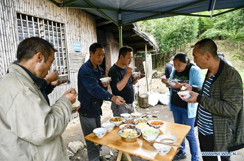 Bamboo shoots collectors eat their lunch in a shed on the Jinfo Mountain in Nanchuan District of southwest China's Chongqing, Aug. 30, 2019. A lucky bamboo shoots collector on the Jinfo Mountain can harvest more than 6,000 bamboo shoots a day, which can increase his income by 7,000 to 10,000 yuan (about 1,398 U.S. dollars) in the harvest season. According to local authorities, Nanchuan District has more than 100,000 mu (about 6,667 hectares) of bamboo shoot forests, which attract more than 10,000 people to collect bamboo shoots every year. (Photo: Xinhua)