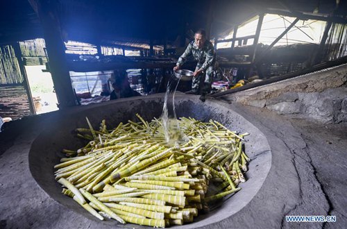 Bamboo shoots collector Zhou Qipei pours water to boil bamboo shoots on the Jinfo Mountain in Nanchuan District of southwest China's Chongqing, Aug. 30, 2019. A lucky bamboo shoots collector on the Jinfo Mountain can harvest more than 6,000 bamboo shoots a day, which can increase his income by 7,000 to 10,000 yuan (about 1,398 US dollars) in the harvest season. According to local authorities, Nanchuan District has more than 100,000 mu (about 6,667 hectares) of bamboo shoot forests, which attract more than 10,000 people to collect bamboo shoots every year. (Photo: Xinhua)