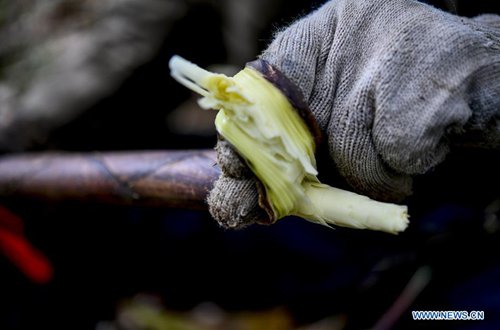 A bamboo shoots collector peels a bamboo shoot on the Jinfo Mountain in Nanchuan District of southwest China's Chongqing, Aug. 30, 2019. A lucky bamboo shoots collector on the Jinfo Mountain can harvest more than 6,000 bamboo shoots a day, which can increase his income by 7,000 to 10,000 yuan (about 1,398 U.S. dollars) in the harvest season. According to local authorities, Nanchuan District has more than 100,000 mu (about 6,667 hectares) of bamboo shoot forests, which attract more than 10,000 people to collect bamboo shoots every year. (Photo: Xinhua)