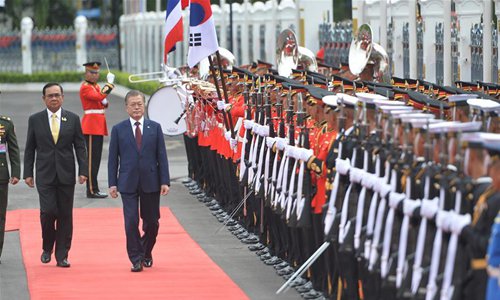 South Korean President Moon Jae-in (2nd L) reviews the guard of honor during a welcoming ceremony held by Thai Prime Minister Prayuth Chan-ocha in Bangkok Sept. 2, 2019. Prayuth Chan-ocha held talks with Moon Jae-in on Monday, when the two countries signed several agreements in varied aspects of bilateral cooperation.(Photo: Xinhua)