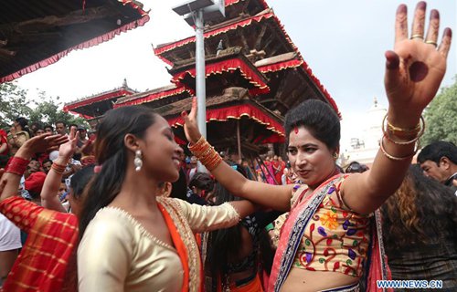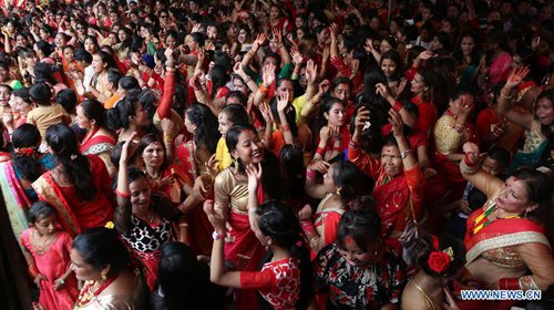 Women dance during celebration of Teej festival in Kathmandu, Nepal, Sept. 2, 2019. Nepali women on Monday celebrated the Hindu festival of Teej, during which married women fast for their husbands' long life and good health while the unmarried pray for ideal husbands. (Photo: Sunil Sharma/Xinhua)