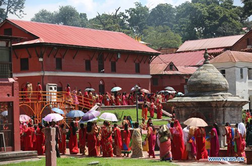 Women dance during celebration of Teej festival at the premises of Pashupatinath Temple in Kathmandu, Nepal, Sept. 2, 2019. Nepali women on Monday celebrated the Hindu festival of Teej, during which married women fast for their husbands' long life and good health while the unmarried pray for ideal husbands. (Photo: Sunil Sharma/Xinhua)