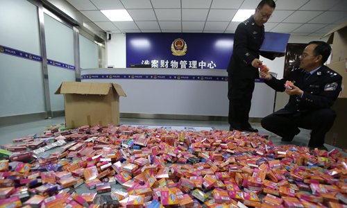 Police from Yuncheng, Shanxi Province, check counterfeit condoms that they tracked down. Photo: IC