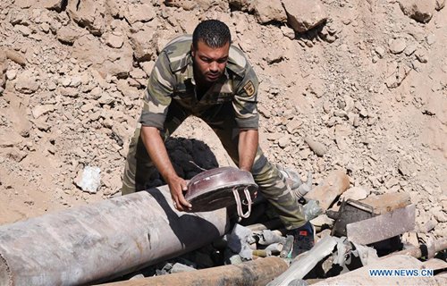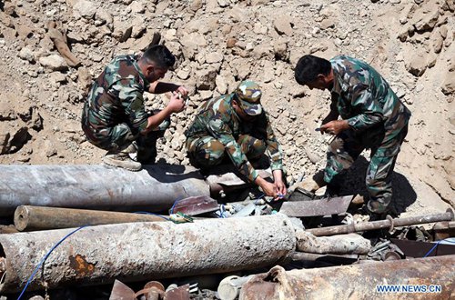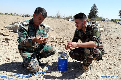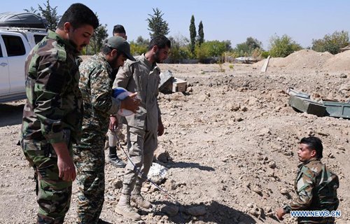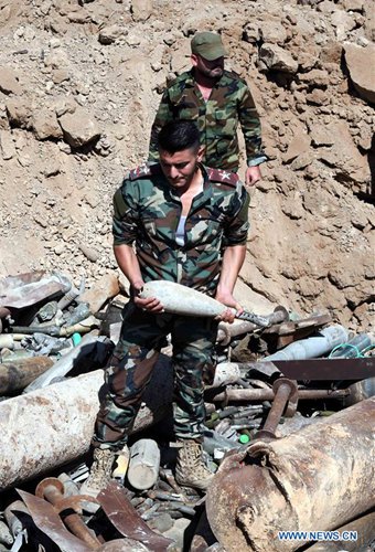 Syrian soldiers dismantle a bomb in the Eastern Ghouta countryside of Damascus, Syria, on Sept. 3, 2019. The Syrian official media said that the army is defusing weapons left by the rebels in Eastern Ghouta. (Photo: Ammar Safarjalani/Xinhua)