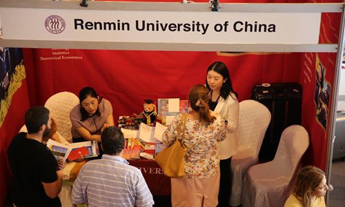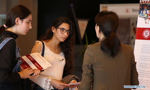 Tunisian students consult representatives from Renmin University of China on studying information at the exhibition of "China Campus 2019" in Tunis, Tunisia, on Sept. 3, 2019. Chinese universities enjoy high quality education and facilities, which could attract more Tunisian students to study in China, Tunisian Minister of Higher Education and Scientific Research Slim Khalbous said Tuesday. (Photo by Adele Ezzine/Xinhua)