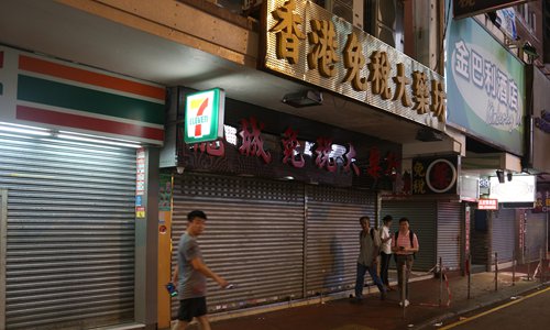 Passengers pass by closed stores in Tsim Sha Tsui during the weekend, when black-clad protesters clashed with the police in the area. Photo: Chen Qingqing/GT