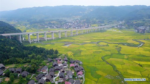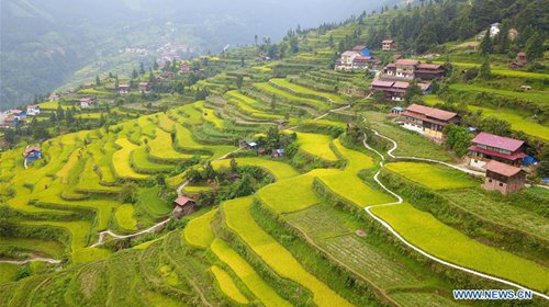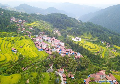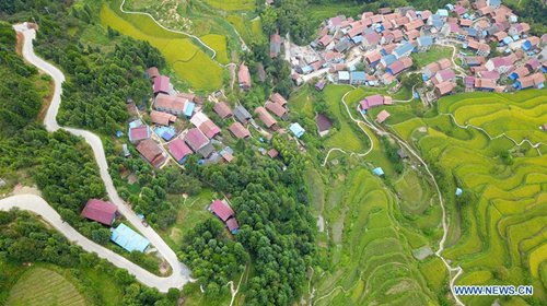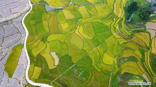 Aerial photo taken on Sept. 3, 2019 shows the terraced lands of paddy fields in Gaoniang Town, Tianzhu County of southwest China's Guizhou Province. (Photo: Xinhua)