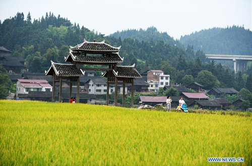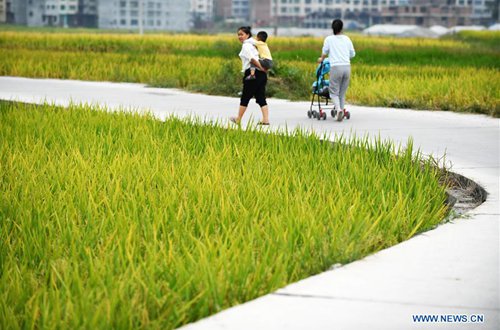 People walk beside the terraced lands of paddy fields in Gaoniang Town, Tianzhu County of southwest China's Guizhou Province, Sept. 3, 2019. (Photo: Xinhua)