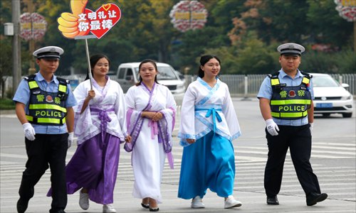 Volunteers wearing traditional Chinese outfits are escorted across a street in Huayin, Northwest China's Shaanxi Province on Wednesday. The sign one of the women is holding reads: Civility makes you the best. Photo: IC