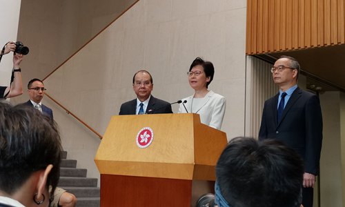 Hong Kong Chief Executive Carrie Lam Cheng Yuet-ngor speaks at a press conference on Thursday, where she defended her four-action plan as the best way forward and stressed that the Hong Kong Special Administrative Region government cannot and will not meet demands that deviate from the rule of law. Photo: Wang Cong/GT