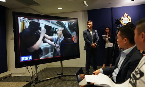 Hong Kong police shows footage of rioters disrupting public order during a media briefing in south China's Hong Kong, Sept. 5, 2019. The Hong Kong police said four males were arrested Wednesday, bringing the total number of the arrested since June 9 to 1,187. (Xinhua/Qin Qing)