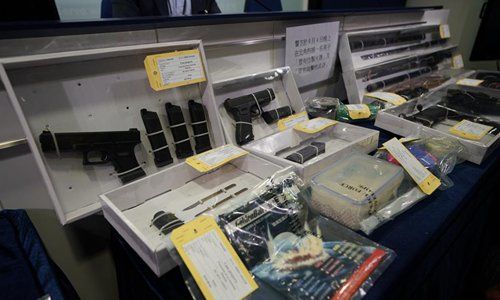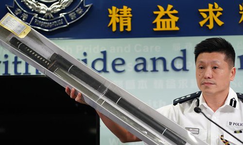 Hong Kong police displays seized weapons during a media briefing in south China's Hong Kong, Sept. 5, 2019. The Hong Kong police said four males were arrested Wednesday, bringing the total number of the arrested since June 9 to 1,187. (Xinhua/Qin Qing)
