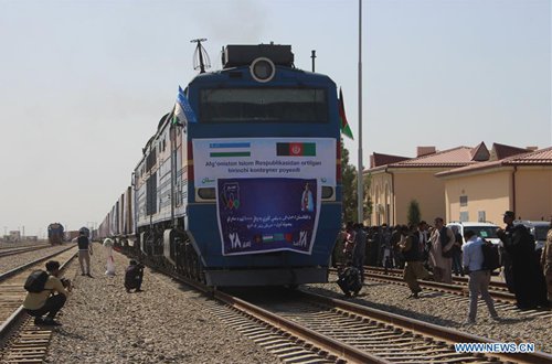 Photo taken on Sept. 5, 2019 shows the first cargo train leaving the port city of Hairatan for China in Balkh province, northern Afghanistan. The first cargo train from Afghanistan to China via Uzbekistan and Kazakhstan departed on Thursday, Uzbek state-owned railway company Uzbekistan Railways has said. The official ceremony for the departure of the train was held at the Hairatan railway station in Afghanistan, the Uzbek company said in a statement. The train is loaded with 41 containers of semi-finished stone of mineral talcum powder, according to the company. (Photo: Xinhua)