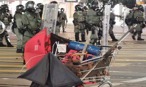 Hong Kong police confiscate a shopping cart filled with makeshift weapons after dispersing a crowd of illegal protesters in Causeway Bay on Sunday night. Photo: Wang Cong/GT