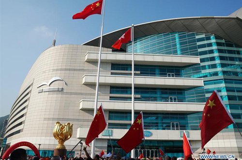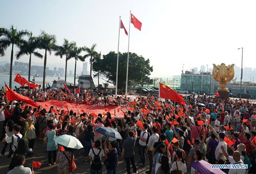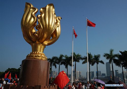 People attend a national flag raising ceremony at the Golden Bauhinia Square in Hong Kong, south China, on Sept. 8, 2019. (Photo: Xinhua)