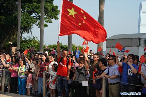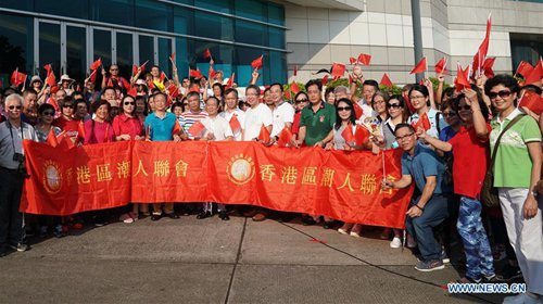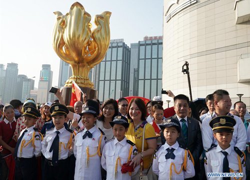 People pose for photos after attending a national flag raising ceremony at the Golden Bauhinia Square in Hong Kong, south China, Sept. 8, 2019.(Photo: Xinhua)