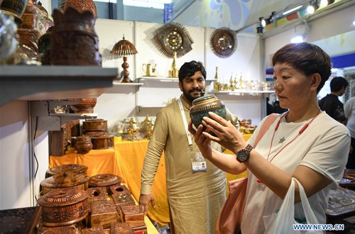 A visitor (R) chooses products from Pakistan during the 4th China-Arab States Expo in Yinchuan, northwest China's Ningxia Hui Autonomous Region, Sept. 7, 2019. Visitors have been dazzled by handicrafts from paricipating countries and regions at the expo. (Photo: Xinhua)