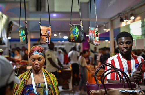 Ghananian exhibitors sell purses during the 4th China-Arab States Expo in Yinchuan, northwest China's Ningxia Hui Autonomous Region, Sept. 7, 2019. Visitors have been dazzled by handicrafts from paricipating countries and regions at the expo. (Photo: Xinhua)