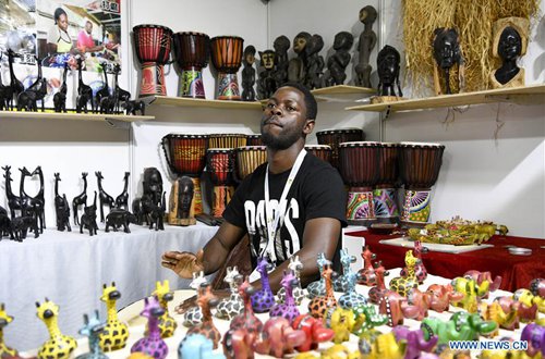A Ugandan exhibitor plays drum to attract visitors during the 4th China-Arab States Expo in Yinchuan, northwest China's Ningxia Hui Autonomous Region, Sept. 6, 2019. Visitors have been dazzled by handicrafts from paricipating countries and regions at the expo. (Photo: Xinhua)