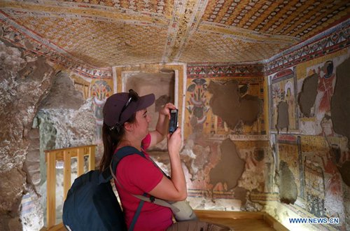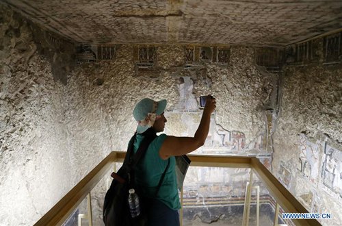 A woman takes photos in the Theban Tomb 286 in Luxor, Egypt, on Sept. 8, 2019. The Egyptian Ministry of Antiquities announced on Sunday the opening of two ancient Egyptian tombs for visitors after their restoration on the Nile River's west bank of Upper Egypt's monument-rich province of Luxor.(Photo: Xinhua)