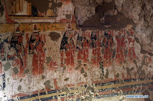 Photo taken on Sept. 8, 2019 shows drawings in the Theban Tomb 286 in Luxor, Egypt. The Egyptian Ministry of Antiquities announced on Sunday the opening of two ancient Egyptian tombs for visitors after their restoration on the Nile River's west bank of Upper Egypt's monument-rich province of Luxor. (Photo: Xinhua)