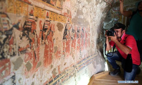 A man takes photos in the Theban Tomb 286 in Luxor, Egypt, on Sept. 8, 2019. The Egyptian Ministry of Antiquities announced on Sunday the opening of two ancient Egyptian tombs for visitors after their restoration on the Nile River's west bank of Upper Egypt's monument-rich province of Luxor. (Photo: Xinhua)