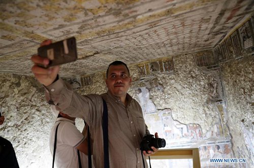A man takes selfies in the Theban Tomb 159 in Luxor, Egypt, on Sept. 8, 2019. The Egyptian Ministry of Antiquities announced on Sunday the opening of two ancient Egyptian tombs for visitors after their restoration on the Nile River's west bank of Upper Egypt's monument-rich province of Luxor. (Photo: Xinhua)