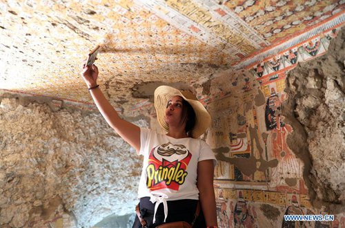 A woman takes selfies in the Theban Tomb 286 in Luxor, Egypt, on Sept. 8, 2019. The Egyptian Ministry of Antiquities announced on Sunday the opening of two ancient Egyptian tombs for visitors after their restoration on the Nile River's west bank of Upper Egypt's monument-rich province of Luxor. (Photo: Xinhua)