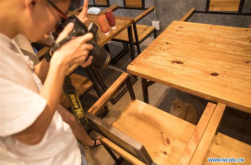 A customer takes photos of a cat at the Animal Cafe in Bangkok, Thailand, Sept. 9, 2019. (Photo: Xinhua)