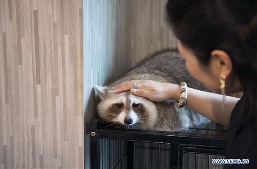 A customer interacts with a raccoon at the Animal Cafe in Bangkok, Thailand, Sept. 9, 2019. (Photo: Xinhua)